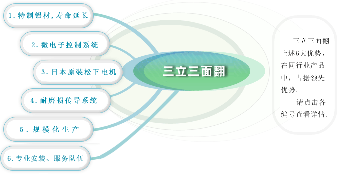now,"three sides turn over" holds the best place of commerce blocks,super highway,exhibition,gymnasium and so on.In the past few years,"three sides turn over" becomes to be popular in ad media. The advantages of "three sides turn over" make it