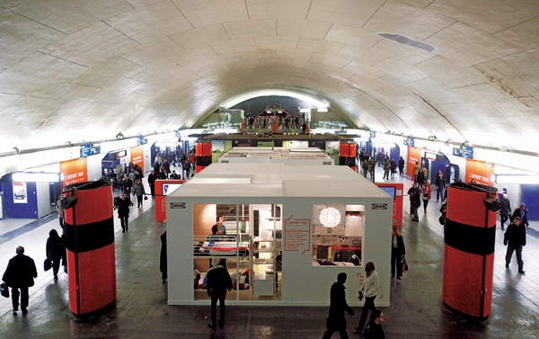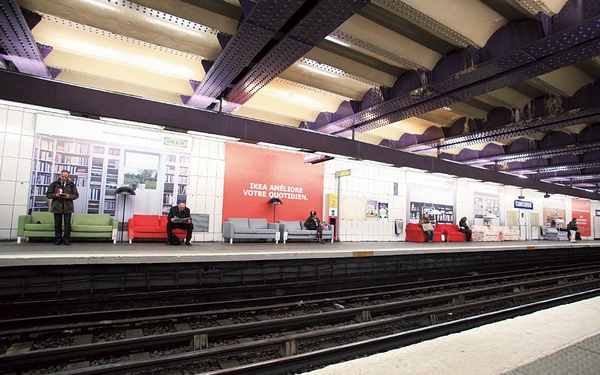2010年3月,宜家曾經(jīng)拆掉巴黎四家重要地鐵站的等候椅,全都換成了各種不同類型的宜家沙發(fā),并在沙發(fā)旁邊擺上了宜家的落地?zé),而背景墻也是樣板間的模樣。旅途勞累、購物途中、下班之后,各色各樣的人坐在那些式樣繁多、色彩繽紛的沙發(fā)上等待列車到來,順便也幫宜家做了一次現(xiàn)場廣告。